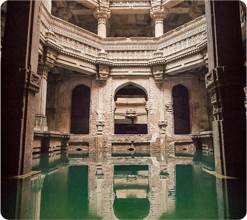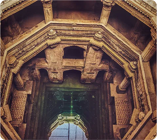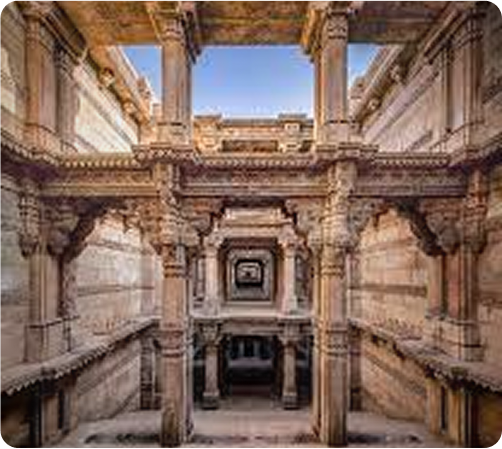 Historic stepwell showcasing 15th-century architecture with intricate carvings in a mix of Gujarati-Maru and Islamic styles, surrounded by serene gardens and local eateries.