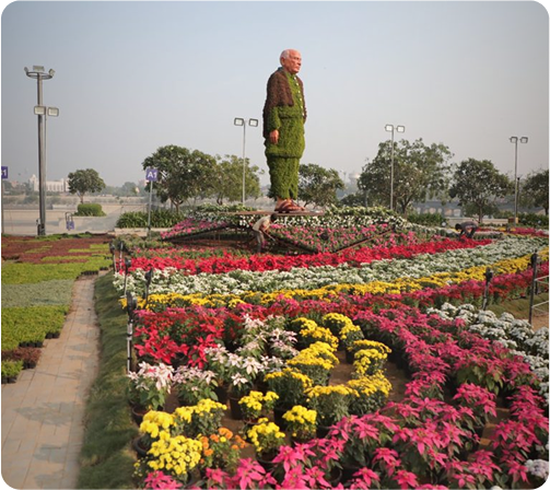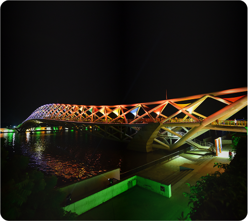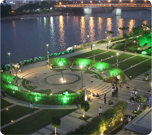 Scenic riverfront with a 7km walkway and cycling path, highlighted by the artistically designed Atal Bridge and evening lights. Features gardens, boating, and a sports complex for recreation.
